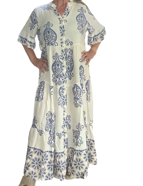 En ljuvlig långklänning som har knappar hela vägen framtill. Den har en kort ärm och ett superfint print. Klänningen är i one size och passar uppskattningsvis bäst till storlek s-xxl.